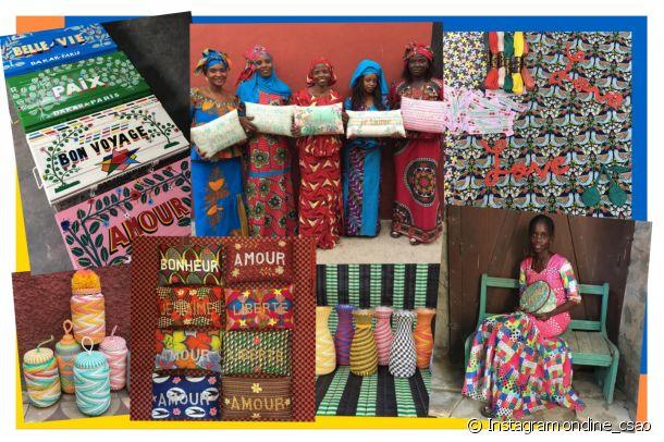 Une tisseuse brodant « je t’aime» sur du tissu africain, le coin d’une rue de Gorée, un pêle-mêle d’imprimés colorés, quelques malles exposées dans sa galerie parisienne… Sur Instagram, Ondine partage son quotidien rythmé de voyages et de créations pour la CSAO. Des photos non retouchées (elle y tient beaucoup) qui donnent un aperçu de son univers créatif et coloré. De retour d’un séjour à Dakar, elle nous reçoit dans sa galerie, rue Elzévir, à Paris. A l’intérieur, des nattes habillent le sol, des fauteuils en perles côtoient des malles estampillées « Bon voyage», « Belle vie» ou « Amour», des coussins en wax (tissu africain) sont porteurs de messages positifs. Un univers propice à l’évasion.