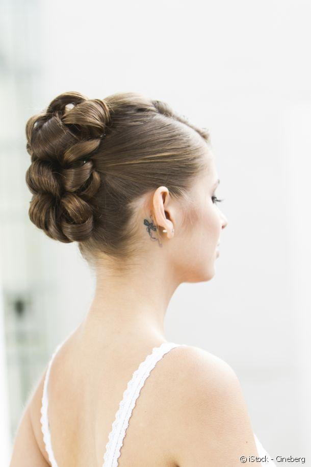 Le bun haut perché se la joue audacieux en version XL. Il prend des airs de fête grâce à une jolie tresse qui met en valeur vos longueurs. Pour réussir cette coiffure, ramenez vos cheveux vers l’arrière en plaquant bien vos mèches. Si vous avez une frange, portez-la légèrement bombée pour habiller le front. Attachez votre chevelure en une queue-de-cheval haute. Séparez-la en deux sections égales de cheveux, puis insérez l’une d’elles dans un bun en mousse et faites revenir vos longueurs dessus pour recouvrir l’accessoire. Il donne du volume et sert de base à la coiffure. Camouflez vos pointes en les fixant à la base du bun avec des épingles. Puis, réaliser une tresse simple à trois brins avec la section restante. Desserrez ensuite un peu les branches pour donner de l’ampleur à la tresse et enroulez la natte à la base du bun pour le décorer. Fixez simplement avec des épingles plates : vous voilà fin prête !